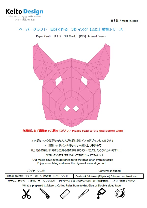 ぶた(ブタ 豚)ペーパークラフトマスク【子供用】かぶりもの 手作り人気動物シリーズ かぶれますく ハロウィン仮装衣装にも!【送料込】Pig 3D Mask Papercraft For Kids DIY